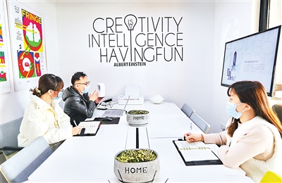 在河北省秦皇岛市海港区,位于金梦海湾片区中瑞设计港的一家公司设计师正在和客户沟通工作方案。 曹建雄摄(人民视觉)
