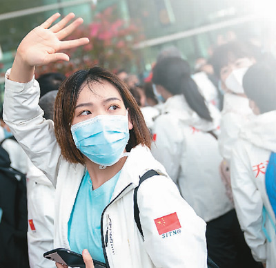 “感谢天使,向您致敬!”“武汉人民永远铭记您!”机场入口,青年志愿者排成整齐两列,每当一支医疗队启程,志愿者都会挥舞国旗,喊出他们的心声。