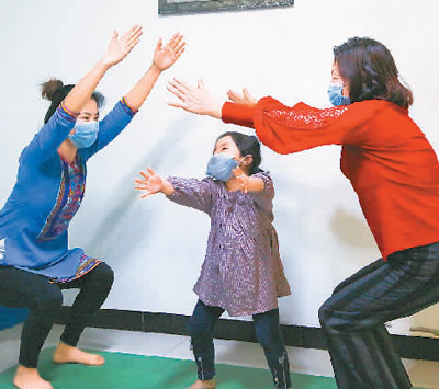 新疆昌吉州呼图壁县通过开展“宅家总动员”短视频大赛征集活动,引导广大群众在做好自我防护的同时,营造幸福和谐的家庭氛围。图为呼图壁县二十里店镇良种场村居民焦丽萍正在和女儿、婆婆一起录制练习瑜伽的短视频。 陶维明摄(人民图片)