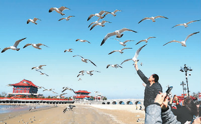 人们在蓬莱市八仙过海景区西侧海滩与海鸥互动。 于良意摄(人民视觉)