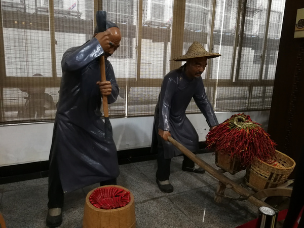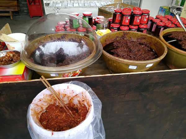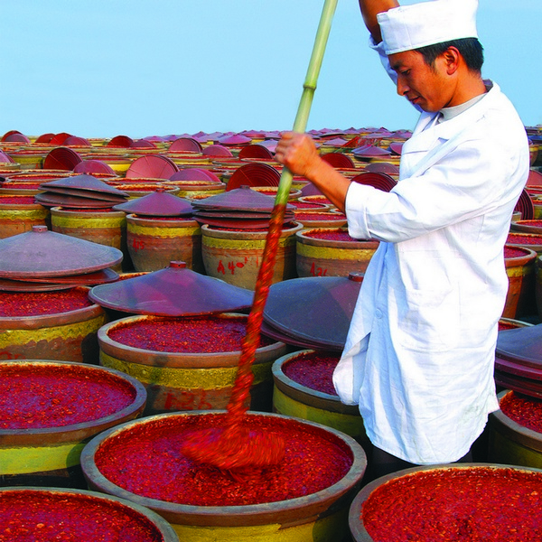 郫县豆瓣具有“色红褐、油润、酱酯香、味鲜辣”之特色,采用独特的传统的特殊工艺,以优质红辣椒为主要原料经过盐渍制成辣椒胚;蚕豆制曲、发酵6个月以上制成甜豆瓣;辣椒胚按比例拌合甜豆瓣入缸翻、晒、露,历时三个月以上酿造成熟。