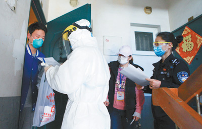 3月21日,江苏常州钟楼区永红街道花园南村社区组织社工和民警探访居家隔离的居民。 史 康摄(人民视觉)