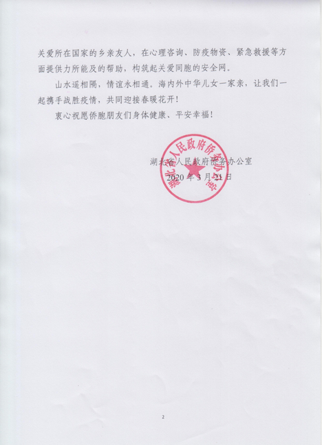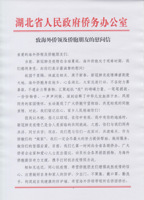 湖北省人民政府侨务办公室致侨胞朋友的慰问信