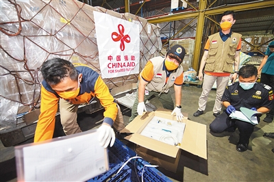 当地时间3月26日晚,中国政府援助印尼用于抗击新冠肺炎疫情的首批医疗物资运抵雅加达。 图为在苏加诺哈达机场,印尼减灾署和海关的工作人员正在清点货物。 新华社记者 杜 宇摄