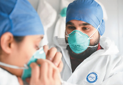 巴基斯坦人豪孟德和毛里求斯人苏玛是一对在浙江温州工作的跨国医生夫妇。在新冠肺炎疫情发生后,他们主动加入了所在的温州和平国际医院志愿团队。 图为2月8日,在温州南防控检查点,豪孟德(右)帮苏玛戴口罩,准备上岗。 新华社记者 翁忻旸摄