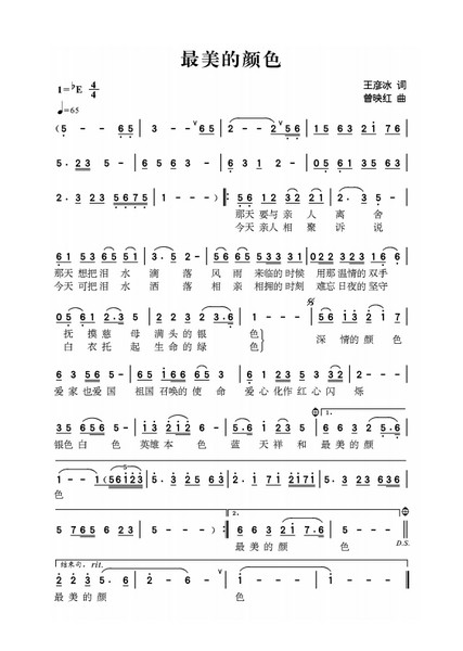 :本歌曲以母亲的银色、天使的白色、生命的绿色、忠心的红色、祥和天空的蓝色及英雄本色的“颜色”为线索,以白衣英雄奔赴一线与亲人分手的画面和凯旋与亲人团聚的画面相辉映,讴歌白衣战士对国家忠诚大义的担当精神。具有美术的画面美、音乐的旋律美与人性的品质美。小角度、大主题。温婉细腻,感情真挚。谨以