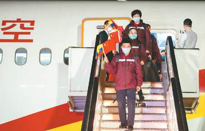 3月30日,在委内瑞拉首都加拉加斯西蒙·玻利瓦尔国际机场,中国抗疫医疗专家组全体成员走下专机。专家组由国家卫生健康委员会组建,来自江苏省,共8人。他们将分享中国抗疫经验。 萨尔戈多摄(新华社发)
