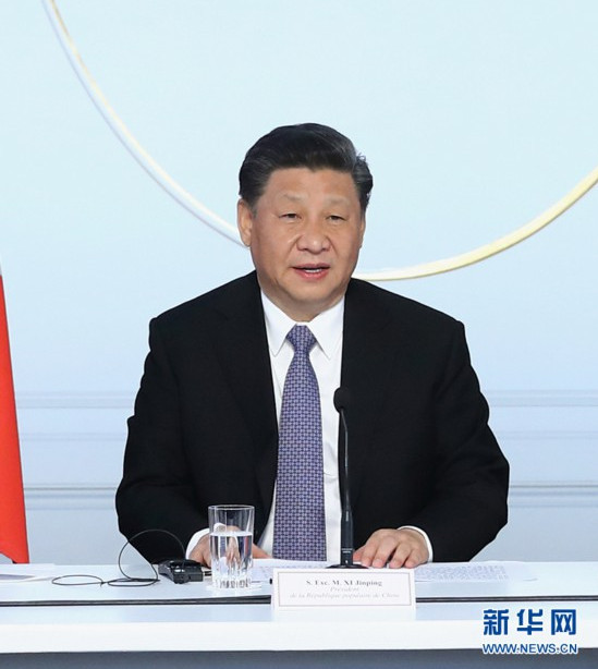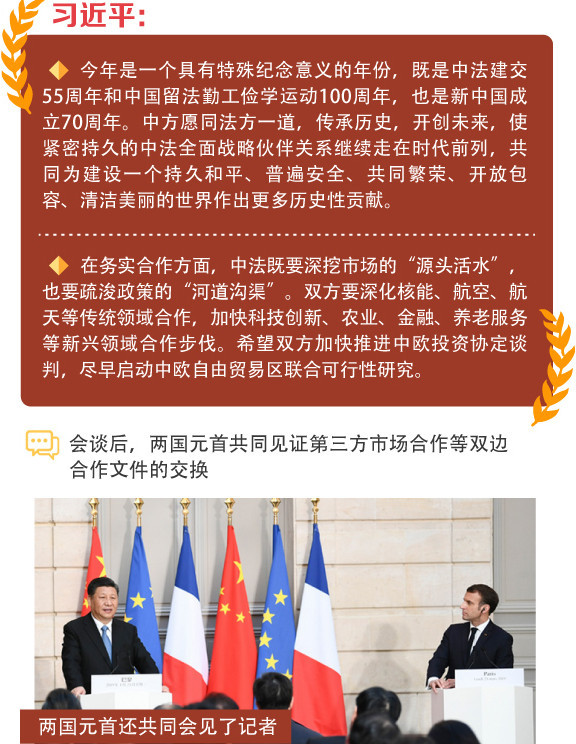 中法友谊源远流长。今年是中法建交55周年。两国已经开展了许多战略性合作,还有很大合作空间。正如法国朋友所说,不登上埃菲尔铁塔,就看不到巴黎最美的风景。新形势下,我们应登高望远,面向未来,加强合作。我们要深化核能、航空航天、农业食品、医疗卫生、汽车制造等传统领域合作,加快推动绿色制造、数字经济、人工智能、金融服务、城市可持续发展等新兴领域合作,加强气候变化合作,全面落实《巴黎协定》,推动今年联合国气候峰会取得积极成果,为两国人民和各国人民谋福祉。