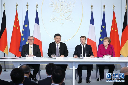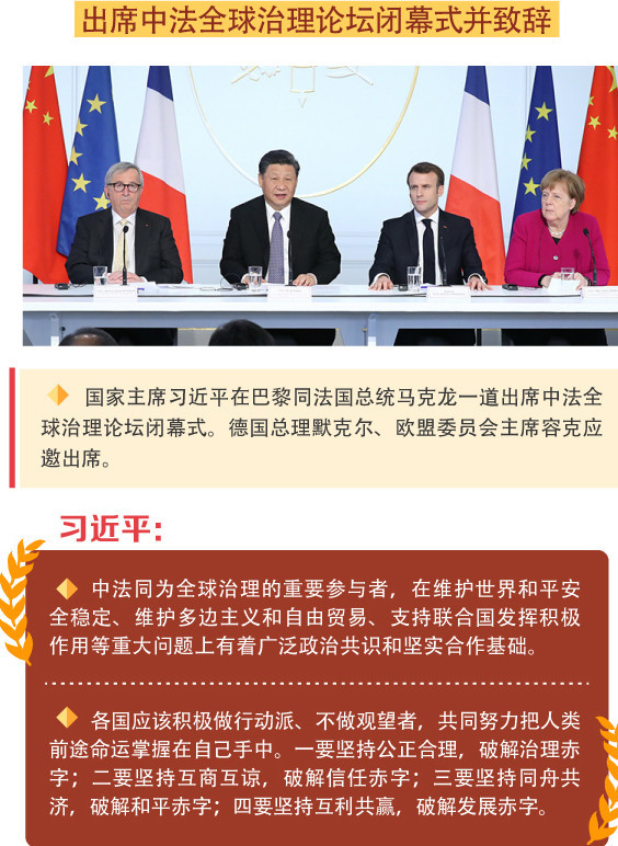 3月26日,国家主席习近平在巴黎同法国总统马克龙一道出席中法全球治理论坛闭幕式。德国总理默克尔、欧盟委员会主席容克应邀出席。