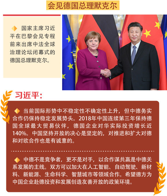 昨天,我同马克龙总统会晤时也围绕全球治理深入交换了意见,达成重要共识。中法同为全球治理的重要参与者,在维护世界和平安全稳定、维护多边主义和自由贸易、支持联合国发挥积极作用等重大问题上有着广泛政治共识和坚实合作基础。中法两国坚持互尊互信、平等相待、开放包容、互利共赢,共同维护国际关系基本准则,共同推进全球治理完善,成为维护世界和平稳定、促进人类文明进步的重要力量。刚刚我同马克龙总统、默克尔总理、容克主席举行了四方会晤,围绕多边主义、中欧战略伙伴关系发展深入探讨,达成了进一步共识。