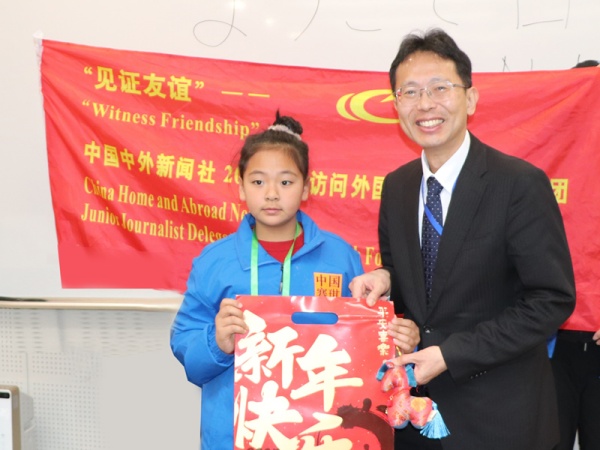 李静娴小记者向园田公使赠送新年礼品,祝福他新年快乐