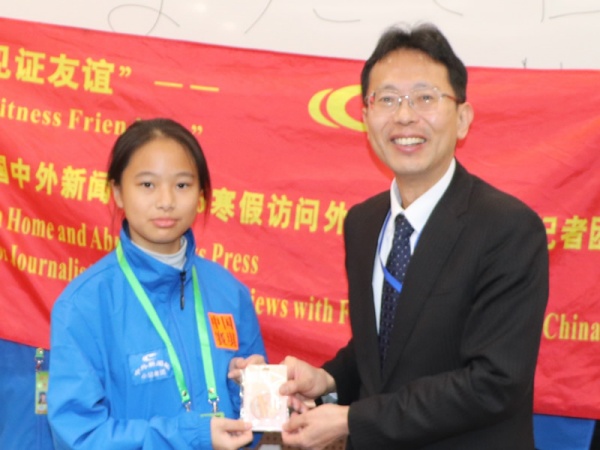 覃慧林小记者向园田公使赠送新年礼品,祝福他新年快乐