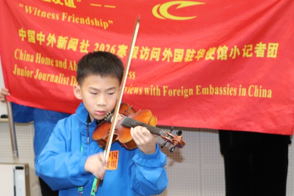 中外新闻社小记者练奕辰在日本大使馆小提琴演奏 在新疆之春》