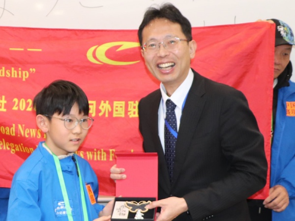 罗梓铭小记者向园田公使赠送家乡的文化礼品,祝福他新年快乐