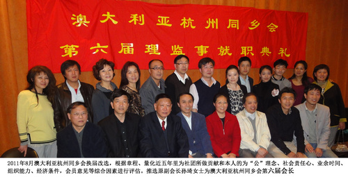 澳大利亚杭州同乡会是一个社会公益性社团组织——是有钱出钱、有力出力,不断地回馈社会的平台;是联谊乡情、互帮互助、相互学习、取长补短的平台;是信息交流、资源共享、团结一致,共同维护自己合法权益的平台。