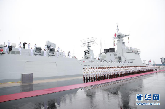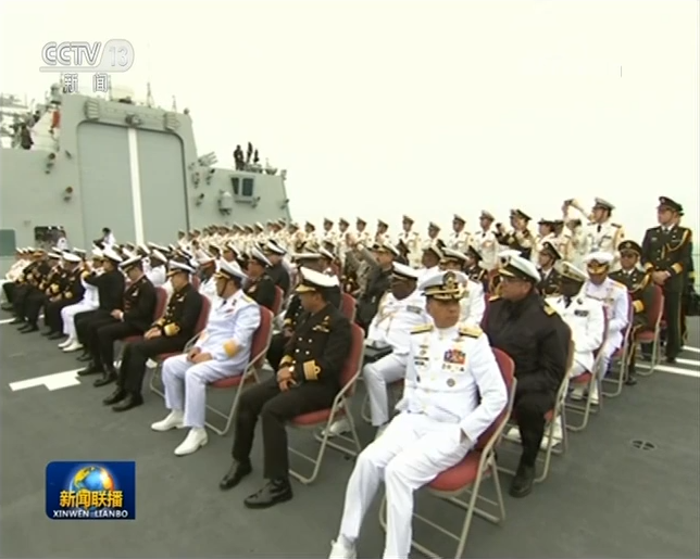 习近平向各国官兵挥手致意。各国海军代表团团长在检阅舰后甲板就座观礼。