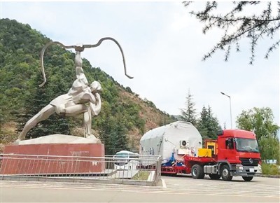 近日,第55颗北斗导航卫星即“北斗三号”最后一颗组网卫星,如期运抵西昌卫星发射中心。图为装载卫星的运输车辆经过发射中心的主题雕塑。 北斗卫星导航系统官方微信公号供图