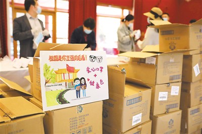 4月15日,在澳大利亚首都堪培拉,中国驻澳大利亚大使馆工作人员将防疫物资装入“健康包”,准备寄送给留学生们。疫情蔓延,中国280多个驻外使领馆把帮助海外留学人员作为当务之急,目前已向留学人员调配50万份“健康包”。 储