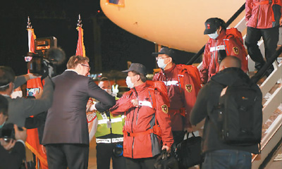 3月21日,在塞尔维亚首都贝尔格莱德,前来迎接的塞尔维亚总统武契奇(左)与中国援助塞尔维亚抗疫医疗专家组成员“碰肘”致意。 新华社记者