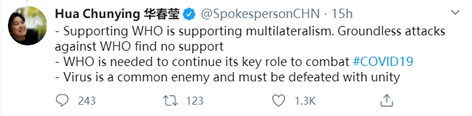 北京时间4月19日下午6时许,华春莹在推特上发文谈及此事,写道:“支持世界卫生组织就是支持多边主义。毫无根据地攻击世卫组织得不到任何支持。需要世卫组织在抗击新冠疫情上继续发挥关键作用。病毒是共同的敌人,(我们)必须团结作战。”