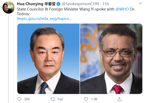 此外,华春莹在另一条推文中转发了中国外交部官网刊登的“中国国务委员兼外长王毅同世卫组织总干事谭德塞通电话”的消息。
