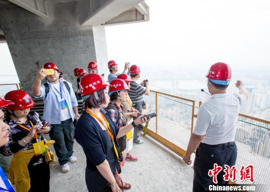 海外华文媒体代表参观还在建设中的武汉绿地中心 张畅 摄