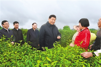 4月20日至23日,中共中央总书记、国家主席、中央军委主席习近平在陕西考察。这是4月21日,习近平在安康市平利县老县镇蒋家坪村女娲凤凰茶业现代示范园区,同茶农们亲切交谈。新华社记者 谢环驰 摄