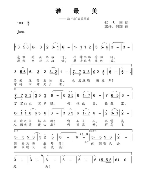 为感恩致敬奋战在“疫”线的医务工作者,以及部队官兵、公安民警、志愿者、爱心人士、基层干部群众等所有为疫情防控作出牺牲和贡献的人们,传递正能量,彰显中国人民不惧万难、坚韧顽强的民族精神,以及人与人之间守望相助、生死不离的暖与爱,激发大家对生活的珍爱,让人们铭记历史,了解并记住这些平凡而伟大的英雄,词作家赵大国与音乐人何耀以及郭丹携手打造了这首战“疫”歌曲——《谁最美》。醉人的旋律、深情的演唱、浓烈的情感,表达了对新时代“最可爱的人”的崇高敬意,展示了全国人民同呼吸共命运的深厚感情。同时,祝福风雨之后的祖国更加强大、更加美好!