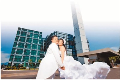新北市八里焚化厂外观雄伟壮丽,成为新人拍摄婚纱照的新景点。 (新北市环保局提供)