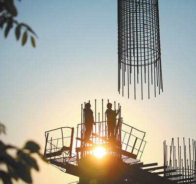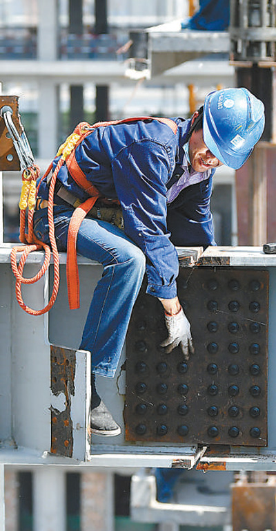 5月1日,在西安电子科技大学网络安全创新研究大楼项目工地上,中建三局的钢结构安装工在作业。 新华社记者 刘 潇摄