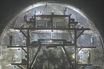 5月1日,金甬铁路千石岩隧道奉化溪口作业区2103米作业面热火朝天,爆破、掘进等工序正有条不紊地进行。 章勇涛摄(影像中国)