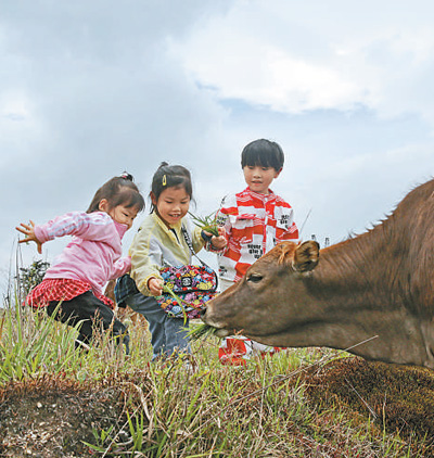 “五一”假期,湖南省桂东县一些群众走出家门,体验近郊游。图为小朋友在桂东县某生态体验区喂牛。 邓仁湘摄(影像中国)