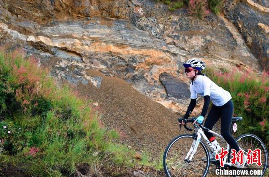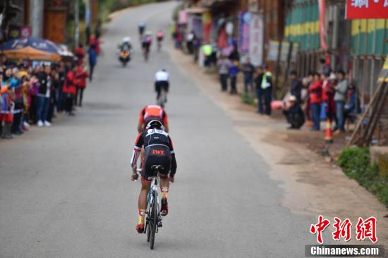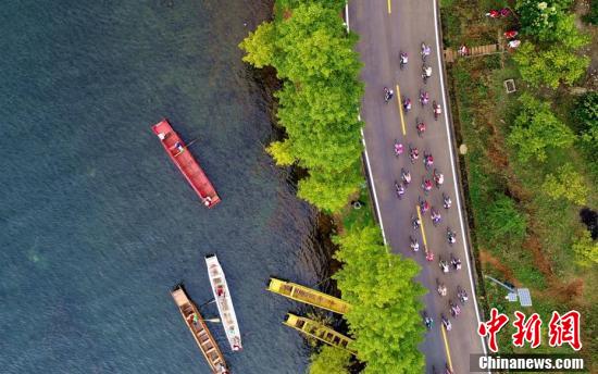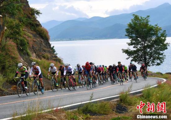 泸沽湖畔正在进行比赛的自行车选手。刘忠俊 摄