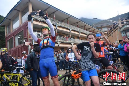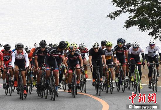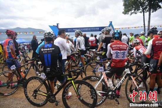 10月15日,2017·中国四川环泸沽湖国际自行车公开赛在四川省凉山彝族自治州盐源县的泸沽湖畔鸣枪开赛。本次比赛吸引了来自美国、加拿大、英国等国家以及全国各地近200名自行车运动员及爱好者参赛。比赛赛道环泸沽湖一周,平均海拔2700米以上,共52公里,包含山地公路、省道及乡村道路,沿途有陡坡、急弯、长下坡等路段,路况复杂,比一般自行车赛更具挑战性。图为比赛现场。 中新社记者 安源 摄