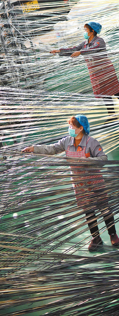 山东淄博市沂源县鲁村镇一塑编企业,工人在生产线上劳作。 赵东山摄(影像中国)