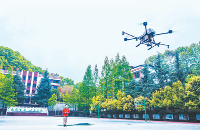 重庆市梁平区实验小学用无人机对校园进行全方位消毒。 高小华摄(人民视觉)