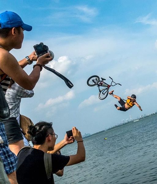 (东湖凌波门,骑着小轮车的年轻人跃东湖中,摄影师@宁波)