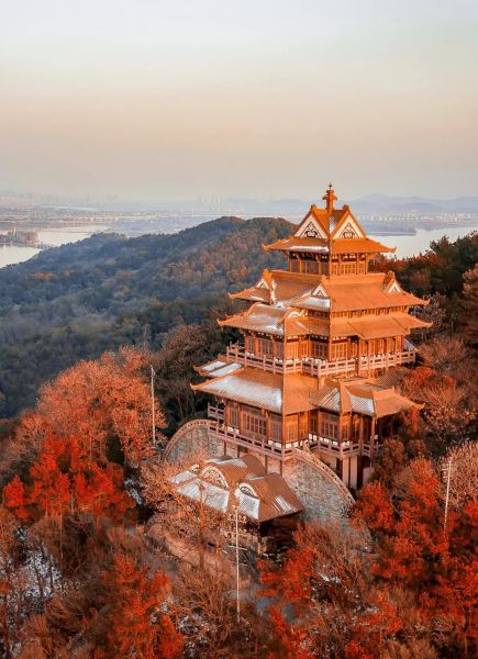 (磨山,位于东湖旁,海拔116.3米,其上建有展示楚文化的复古建筑楚天台,摄影师@赖炜)