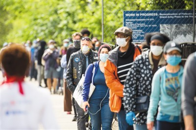 近日,美国纽约,人们在一个发放点排队领取口罩。 郭 克摄(新华社发)