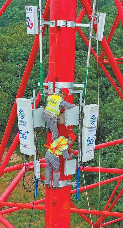 5月9日,江苏镇江,施工人员在五峰山“大跨越”铁塔上安装5G通信射频无线装置。 辛 一摄(影像中国)