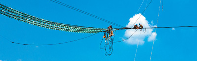 5月3日,秦岭之巅的云端,特高压电网建设者奋战在青海至河南±800千伏特高压直流输电工程(陕西段)建设高空现场。 新华社记者 陶 明摄