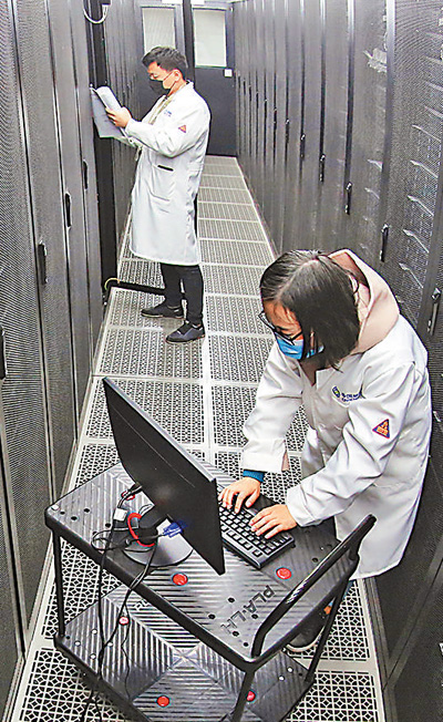 3月24日,中国移动(襄阳)数据中心,网络工程师在新型绿色仓储式数据中心进行网络调试。 王 虎摄(影像中国)