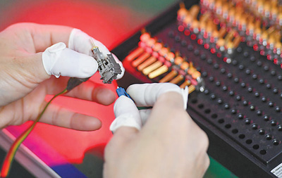 4月26日,江西省高安市一家光电技术公司,工人在加紧赶制5G光纤连接器部件。 周 亮摄(影像中国)