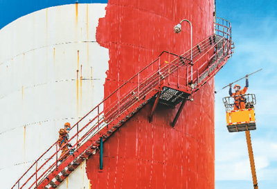 4月22日,中国石化安庆分公司工人为生产设备刷新漆。 程周平摄(人民视觉)