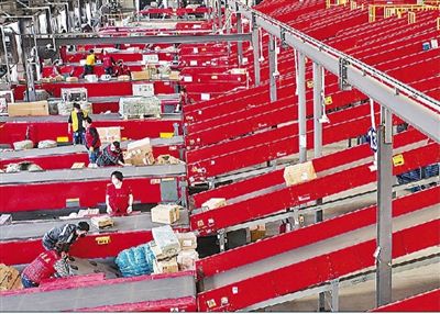 4月15日,在山东即墨国际陆港青岛顺丰华骏分拨中心,智能分拣线上的不同货物正在被快速分拣。梁孝鹏摄(影像中国)