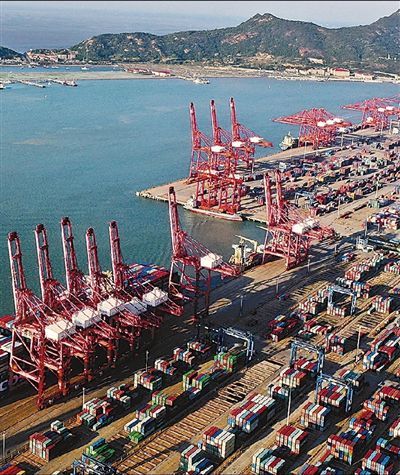 5月11日,江苏连云港港集装箱码头一派繁忙景象。王春摄(影像中国)