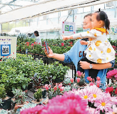 江苏南通市民在五里树花卉基地扫码购买鲜花,体验不接触购物带来的便捷。 王俊荣摄(人民视觉)
