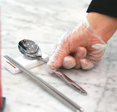 在北京市朝阳大悦城一家餐饮店内,食客隔位而坐,餐具“公私”分明。“开始使用公筷、公勺时,有点不习惯,不过现在已经适应了,分着吃更安全。”在店内用餐的黄先生说。