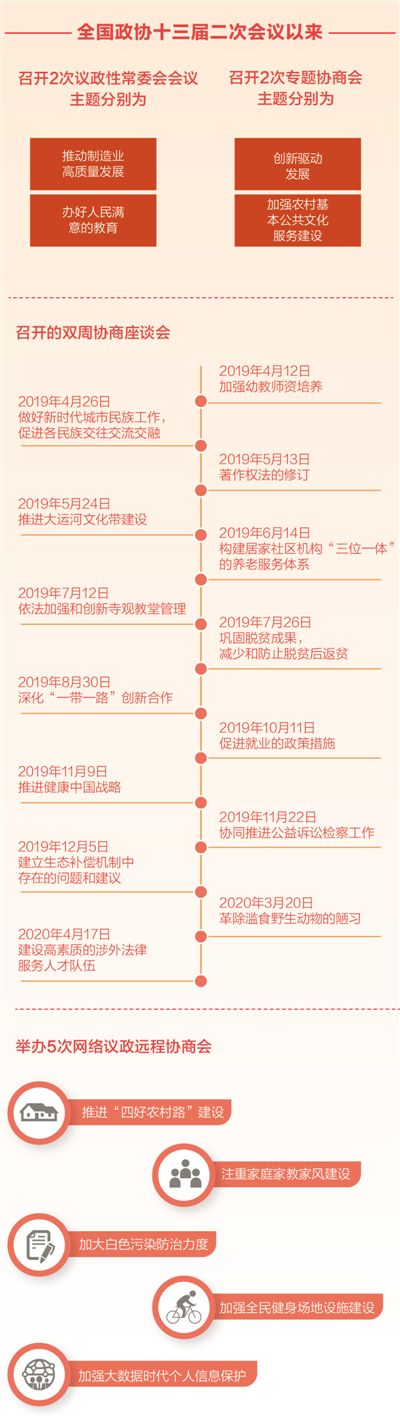 过去的一年,类似的场景在人民政协的各项工作中并不鲜见。全国政协委员们就推进民族地区脱贫攻坚等展开协商调研,围绕巩固脱贫成果、减少和防止贫困人口返贫集中建言,提出关于建立返贫监测预警和应急救助机制等切中肯綮的建议;开展推进四好农村路建设远程协商,推动了相关文件出台;举行农村基本公共文化服务建设专题协商会,有关方面专题研究采纳议政成果……家庭家教家风建设、幼教师资培养、民办教育发展、乡村队伍教师建设、促进就业政策、健康中国战略、基层公共卫生服务体系、养老服务、公益诉讼检察工作、大数据时代个人信息保护……这些群众关心、社会关注的话题都成为全国政协协商建言的题目。
