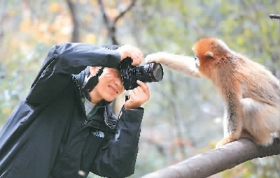 秦岭深处佛坪县大坪峪,摄影师将镜头对准金丝猴,猴儿将手搭在了相机上。 赵建强摄